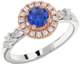 Diamond Blue Sapphire White Rose Gold Halo Round Engagement Ring