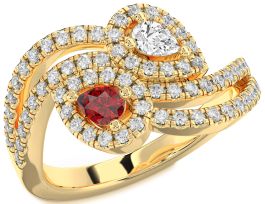 This Promise ring dazzles with a modern dual-drop motif featuring a pear-shaped white gemstone and a richly hued purple stone, each framed by twin halos of sparkling diamonds. The bypass-style band glistens with pavé-set accents, gracefully sweeping around the centerpieces. Set in polished yellow gold, this Promise ring is a radiant symbol of love, unity, and lasting devotion.
