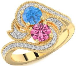 This vibrant promise ring features two dazzling round stones—one in bold pink and the other in bright blue—set in a lavish swirl of white accent diamonds and intricate milgrain detailing. Crafted in radiant yellow gold, the ring's flowing design symbolizes the harmony of two hearts. A perfect expression of love and commitment, this promise ring celebrates your unique bond.