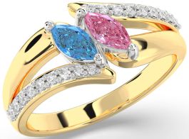 This captivating promise ring features two marquise-cut gemstones—one deep red and the other vibrant green—set in a striking bypass design that symbolizes connection and devotion. Crafted in polished yellow gold, the ring is enhanced by pavé-set diamonds that line the split shank for added brilliance. A meaningful promise ring to represent unity, passion, and enduring love.
