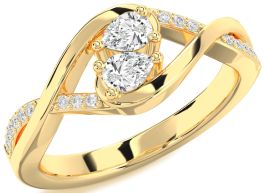 This Promise ring features a graceful swirl design that cradles two stunning pear-shaped gemstones—one deep green and the other radiant white. The bypass band is adorned with glittering pavé diamonds, adding brilliance and elegance. Crafted in polished yellow gold, this ring symbolizes the intertwining of two hearts and eternal devotion. A beautiful gesture of love and promise.