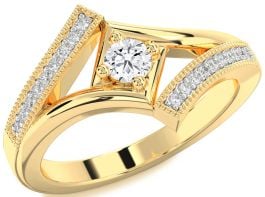 This bold and contemporary Promise ring features a striking geometric design with a prominent round-cut center diamond held in a four-prong setting. The split shank, lined with pavé-set diamonds and bordered by milgrain detailing, adds a modern architectural flair. Crafted in polished yellow gold, this Promise ring symbolizes strength and enduring commitment in a uniquely elegant form.