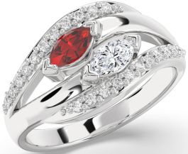 This captivating gold Promise ring showcases two marquise-cut gemstones—one deep red and the other a brilliant white—set side by side in an open bypass design. The vibrant stones are cradled by petite heart-shaped prongs and flanked by twin rows of shimmering round diamonds that arc gracefully along the split band. A bold yet elegant piece symbolizing passion and harmony.