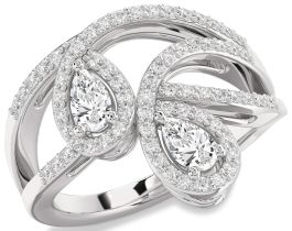 This exquisite promise ring features a captivating design with two pear-cut gemstones—one a brilliant emerald green, the other a sparkling white—each encircled by dazzling pavé diamonds. The sculptural gold band flows into graceful loops, enhancing the fluid symmetry of the piece. A dazzling expression of eternal love and commitment, ideal as a promise ring.