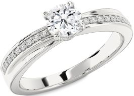 Modern and refined, this engagement ring features a luminous center stone elevated by a sleek four-prong setting. The wide band is elegantly detailed with a channel of glittering accents, adding dimension and brilliance to the overall look. Bold yet sophisticated, this design is a powerful symbol of lasting love with a contemporary touch of glamour and grace.
