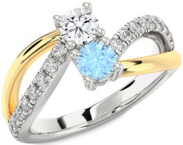 This elegant promise ring showcases two round brilliant-cut center stones—one icy blue and the other white—nestled within a graceful bypass band. The polished gold setting is accented with a row of sparkling diamonds on each side, adding depth and brilliance. A perfect symbol of commitment, this promise ring beautifully captures the harmony of love and unity in every detail.