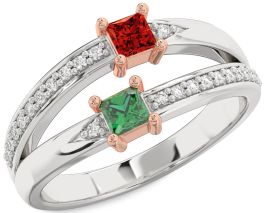 This exquisite gold Promise ring features a unique twin-band design, each set with a vibrant princess-cut gemstone—one a deep ruby red, the other a brilliant emerald green. Delicate white diamonds line both bands, enhancing the elegance and sparkle. The open crossover structure adds modern flair, while the gemstone pairing makes this ring both colorful and symbolic.