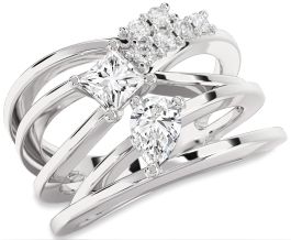 This exquisite Promise ring radiates modern elegance with its intricate multi-band design in polished yellow gold. It showcases a captivating square-cut pink gemstone and a brilliant pear-cut white stone, both securely prong-set for maximum sparkle. A cascade of round accent diamonds crowns the top, adding extra shimmer and luxury. This ring symbolizes love, unity, and timeless commitment.