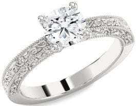 Romantic and timeless, this engagement ring features a luminous center stone set atop an exquisitely detailed band. Intricate floral engravings and milgrain edges give it a vintage charm that evokes classic elegance and enduring love. Perfect for those who appreciate artistry and tradition, this ring tells a beautiful story of devotion with every delicate detail.