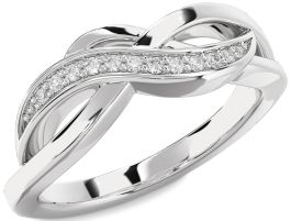 Sleek and refined, this ring features a gently twisting design that forms an abstract infinity motif. A central ribbon of brilliance flows seamlessly along the upper curve, adding a touch of shimmer to its graceful movement. With its clean lines and contemporary flair, this piece is a timeless tribute to enduring love, balance, and the beautiful journey two hearts take together.