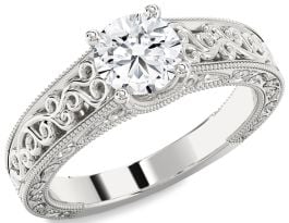 Rich in detail and romance, this engagement ring features a brilliant center stone set atop an ornate band of open filigree scrollwork. Intricate milgrain edges and textured engravings bring vintage charm and craftsmanship to every curve. A stunning tribute to enduring love, this design is perfect for those who cherish elegance with timeless artistry and graceful flair.