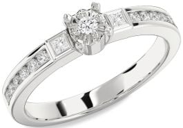 With bold lines and a structured elegance, this engagement ring brings a touch of modern artistry to classic romance. A star-like setting embraces the center stone, while channel-set accents create a sleek, geometric flow along the band. Perfectly balanced between tradition and contemporary flair, this design honors enduring love with confidence, charm, and architectural beauty.