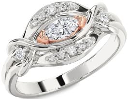 This elegant gold Promise ring centers around a marquise-cut diamond embraced by petite heart-shaped prongs. A delicate braid motif weaves through the band, flanked by a radiant arrangement of round accent diamonds above and below. Additional clustered diamonds enhance the shoulders, creating a luxurious yet romantic design that balances sparkle with graceful symmetry.