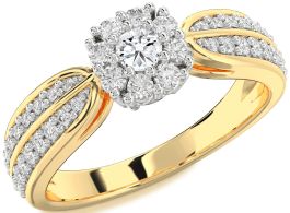 This Promise ring features a dazzling cluster of round-cut diamonds arranged in a floral halo at its center, symbolizing blossoming love. The split shank band is beautifully adorned with three rows of pavé-set diamonds, adding dimension and radiance. Crafted in warm yellow gold, this ring is a brilliant and romantic expression of a heartfelt promise.