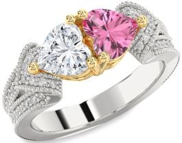 This Promise ring features two heart-shaped center stones nestled together in a side-by-side setting, symbolizing unity and lasting affection. The band is beautifully adorned with intricate pave-set accents and beaded milgrain detailing that frame the hearts with elegance. The elaborate design and craftsmanship make it a timeless statement of deep love and enduring devotion.