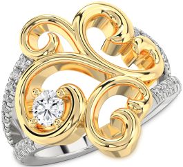 This Promise ring showcases an ornate and romantic scrollwork design in gleaming yellow gold. The swirling curves form an openwork pattern, accented by pavé-set diamonds along the outer band for added sparkle. At the heart lies a brilliant round-cut center diamond, prong-set for security and shine. A unique Promise ring that embodies creativity, elegance, and heartfelt commitment.