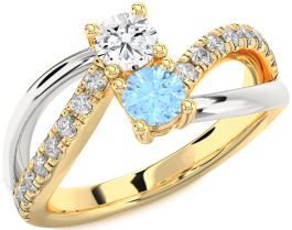 This elegant promise ring showcases two round brilliant-cut center stones—one icy blue and the other white—nestled within a graceful bypass band. The polished gold setting is accented with a row of sparkling diamonds on each side, adding depth and brilliance. A perfect symbol of commitment, this promise ring beautifully captures the harmony of love and unity in every detail.