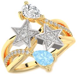 This whimsical Promise ring features a charming celestial design in polished yellow gold, capturing a sense of magic and joy. Two dazzling star motifs accented with round diamonds are nestled between pear-shaped yellow and blue gemstones. The graceful split shank, adorned with glittering stones, evokes wonder and connection. A playful yet meaningful piece, it celebrates love that shines bright.