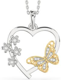 Large Diamond White Yellow Gold Heart Flower Butterfly Necklace