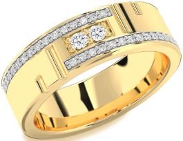 This bold and elegant gold Promise ring showcases a captivating combination of a white and a yellow round diamond set side-by-side at the center. Encircling the centerpiece are twin rows of pavé-set white diamonds that add brilliance and sophistication. With its sleek geometric grooves and contemporary styling, this piece reflects both modern taste and enduring luxury.