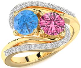 This elegant promise ring features two brilliant round gemstones—one vivid blue and one radiant pink—set side by side in perfect harmony. The duo is nestled within a sweeping yellow gold band lined with sparkling accent diamonds, symbolizing a bond of everlasting love. With its vibrant color contrast and graceful curves, this promise ring is a heartfelt statement of commitment and affection.