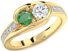 This elegant promise ring showcases a sleek, modern design with two round gemstones—one a rich green and the other a classic white—set side by side in a secure bezel-style embrace. The highly polished gold band is accented with a row of dazzling pavé-set diamonds on each side, enhancing its brilliance and depth. A timeless symbol of loyalty, love, and shared dreams.
