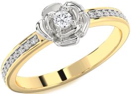 This Promise ring is a floral-inspired masterpiece, featuring a round brilliant diamond delicately nestled at the heart of a sculpted rose design in rich yellow gold. The petals curve gracefully around the center stone, symbolizing love in full bloom. Pavé-set diamonds adorn the shoulders, adding sparkle and charm to this romantic and meaningful expression of commitment.