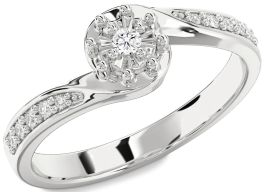 This Promise ring showcases a modern interpretation of elegance with its floral-inspired central design. A round brilliant diamond sits at the heart of a radiating pattern framed by golden prongs, creating a starburst-like effect. The shank is gracefully set with a row of pavé-set diamonds on each side, adding delicate sparkle and symbolism to this timeless gesture of commitment.