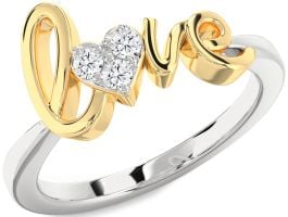Celebrate affection with this expressive promise ring, where the word "Love" is crafted in flowing gold script, integrating into the band. At the center lies a heart shape adorned with three vibrant gemstones—blue, pink, and white—each representing a unique bond and cherished memory. The colorful palette and meaningful inscription make this promise ring a heartfelt symbol of devotion.