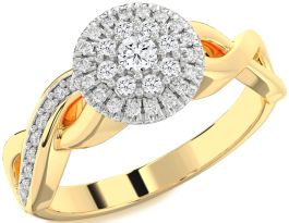 This Promise ring showcases a dazzling halo design, featuring a round center diamond surrounded by two radiant tiers of brilliant accent stones. The intricate cluster is framed with fine milgrain detailing, while the split yellow gold band is accented with pavé-set diamonds, creating a timeless and eye-catching expression of lasting devotion and elegance.