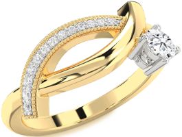 This Promise ring features a distinctive contemporary design, with a polished yellow gold band that curves upward into a marquise-like frame. A row of pavé-set diamonds is bordered by delicate milgrain accents, adding vintage charm. The brilliant round-cut center diamond is secured in a four-prong setting, making this Promise ring a bold symbol of love and commitment.
