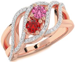 This striking promise ring features two round-cut center stones—one a vivid pink and the other a sparkling white—nestled in an elegant bypass setting. The intertwining gold band is adorned with rows of shimmering pavé diamonds that frame the central gems in graceful curves. A meaningful symbol of unity and devotion, this promise ring radiates beauty, love, and timeless commitment.