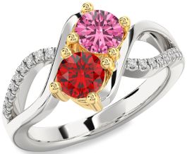 This exquisite promise ring showcases a graceful bypass design in polished yellow gold, featuring two dazzling round-cut stones—one vivid red and the other soft pink—set side by side in prong settings. A sparkling row of pavé-set diamonds flows along the split band, adding elegance and brilliance. This ring is a meaningful symbol of love, connection, and a heartfelt lifelong promise.