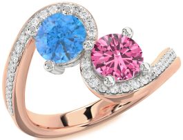 This elegant promise ring features a captivating bypass design, adorned with two brilliant round stones—one in a vibrant blue and the other in a romantic pink. Delicate white accent stones trace the sweeping curves of the polished gold band, adding shimmering detail and dimension. Symbolizing unity and everlasting love, this promise ring is the perfect expression of a heartfelt commitment.