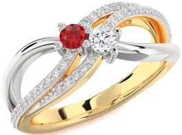 This enchanting promise ring features a graceful bypass design in glowing yellow gold, highlighted by a vibrant red and a classic white gemstone nestled at its center. The intersecting bands are adorned with sparkling accent diamonds, adding brilliance and sophistication. This ring is a heartfelt expression of everlasting love and a perfect symbol of a shared promise.