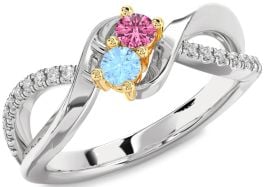 This stunning promise ring features a graceful infinity-style bypass design in radiant yellow gold. At the heart of the ring, two round-cut gems—one soft pink and the other icy blue—are cradled in prong settings, symbolizing unity and enduring love. A line of pavé-set diamonds arcs along the split band, adding brilliance and depth to this meaningful symbol of your everlasting bond.