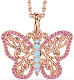 Large Aquamarine & Pink Sapphire Rose Gold Butterfly Necklace