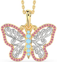 Large Aquamarine & Pink Sapphire White Yellow Gold Butterfly Necklace