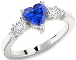 Diamond Blue Sapphire Silver Heart Three Stone Engagement Ring