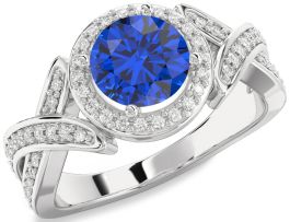 Diamond Blue Sapphire White Gold Halo Round Pave Engagement Ring