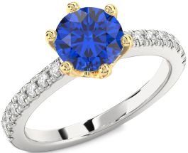 Diamond Blue Sapphire White Yellow Gold Round Solitaire Pave Engagement Ring