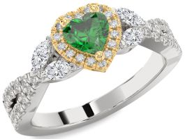 Diamond Emerald Silver & 10K gold Heart Halo Engagement Ring