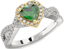 Diamond Emerald Silver & 10K gold Heart Halo Pave Engagement Ring