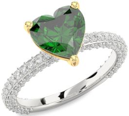 Diamond Emerald Silver & 10K gold Heart Solitaire Pave Engagement Ring
