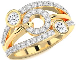 This stunning promise ring showcases a bold concentric circle design adorned with pavé-set white stones that add captivating brilliance and texture. Two bezel-set round gemstones—one in passionate red and the other in soft pink—symbolize love and connection. Crafted in radiant yellow gold, this ring is a beautiful expression of commitment, perfect for marking a heartfelt promise.