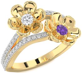 This enchanting promise ring features two floral motifs in lustrous yellow gold, each blossoming with a round center stone—one sky blue and one white. The split shank is lined with shimmering pavé diamonds, adding elegance and sparkle. A radiant symbol of love, this promise ring beautifully celebrates your heartfelt connection with a playful yet graceful design.