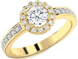 A radiant round center is encircled by a gleaming halo of sparkling stones, creating a luminous crown of light. The band is adorned with two rows of accent stones that extend gracefully along its shoulders, adding brilliance and structure. Classic yet modern, this Engagement Ring reflects a perfect balance of refinement and romance, designed to honor a love that is both enduring and full of grace.