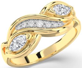 This artistic gold Promise ring features two marquise-shaped gemstones—one a shimmering white, the other a vivid pink—nestled in heart-tipped prongs on opposite ends of the bypass-style band. A delicate curve of round brilliant diamonds flows between them, creating a graceful arc. The dynamic design symbolizes two distinct yet harmoniously united souls, framed in radiant elegance.