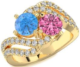 This stunning promise ring is crafted in radiant yellow gold and showcases two brilliant round center stones—one white and one pink—set side by side to symbolize unity and love. Sparkling diamond accents cascade along the gracefully split shank, enhancing the ring’s luxurious feel. A perfect promise ring to express your deep bond and everlasting commitment with elegance and charm.