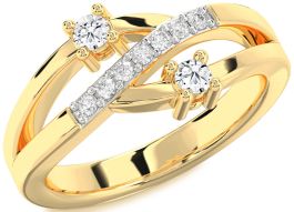 This charming promise ring features a unique split shank band in polished yellow gold, adorned with a sparkling row of accent diamonds. At its heart are two round stones—one clear and the other pink—symbolizing love and unity. With its elegant design and meaningful gem pairing, this ring is a beautiful celebration of commitment and lasting connection.